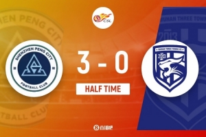 伤停补时4分钟。上半场比赛结束,深圳新鹏城3-0武汉三镇。